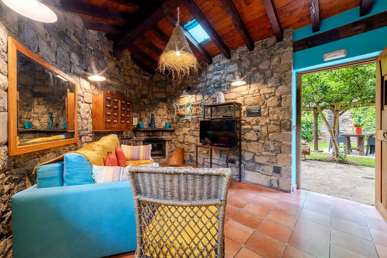 Apartamento de un dormitorio con pared de piedra en el salón, chimenea. Jacuzzi extra doble en el baño. Jardín privado.