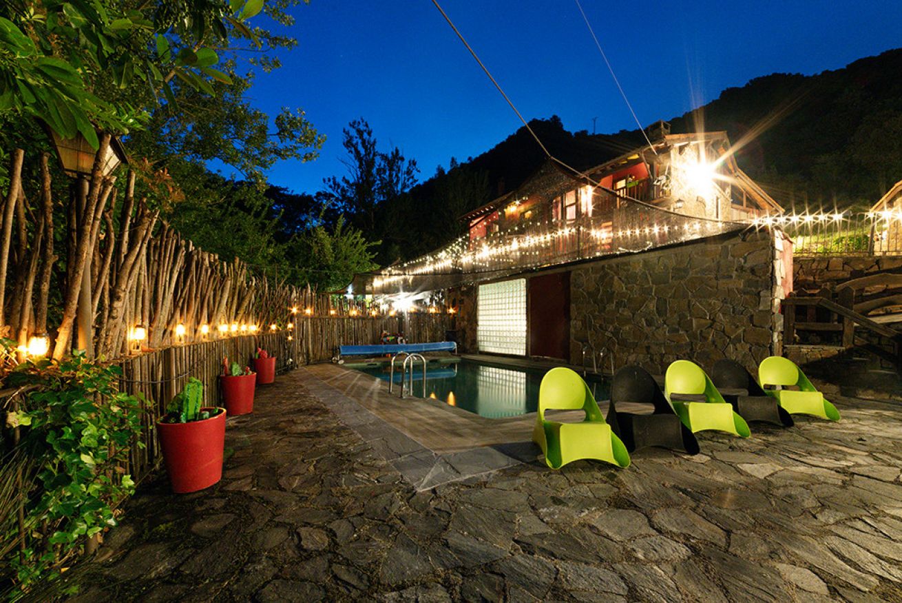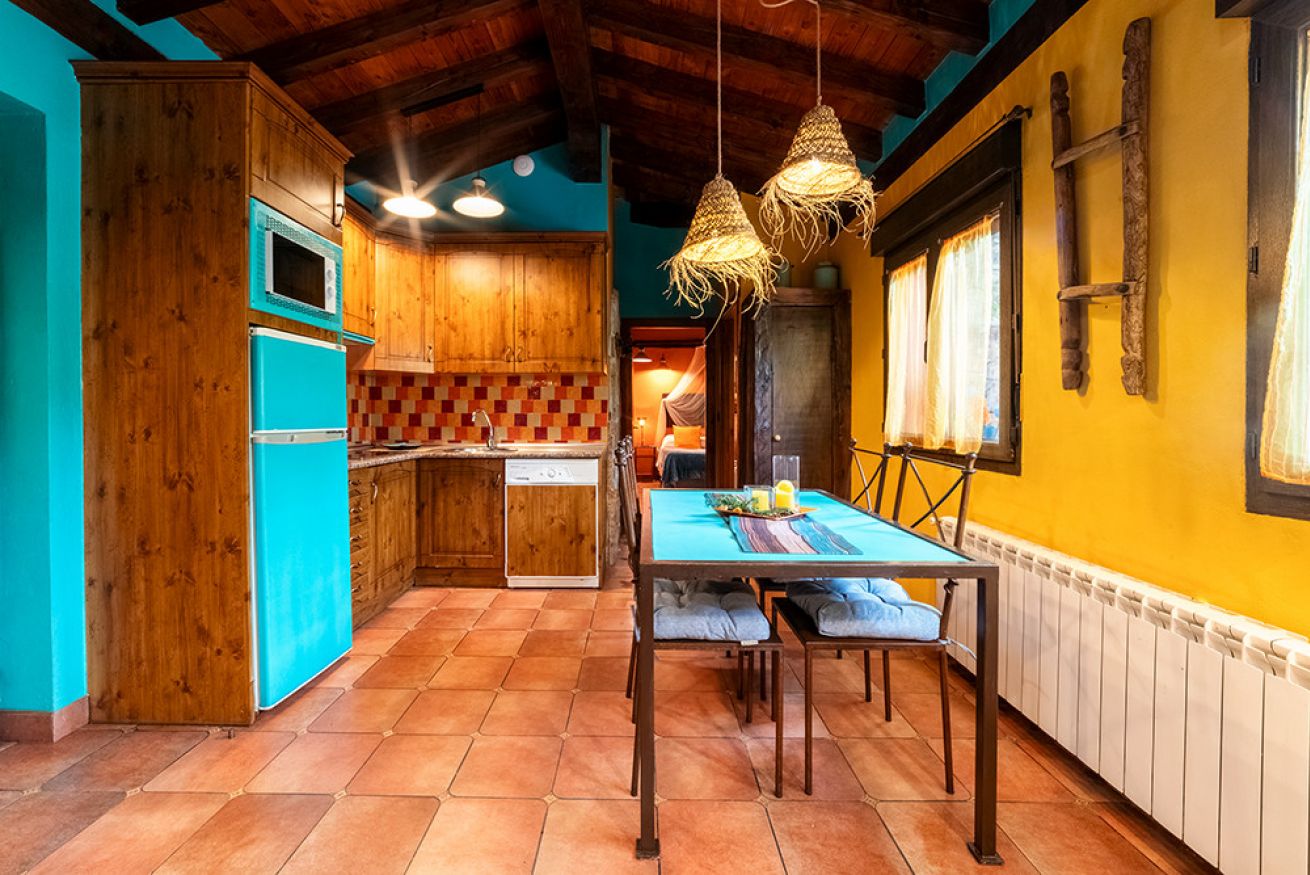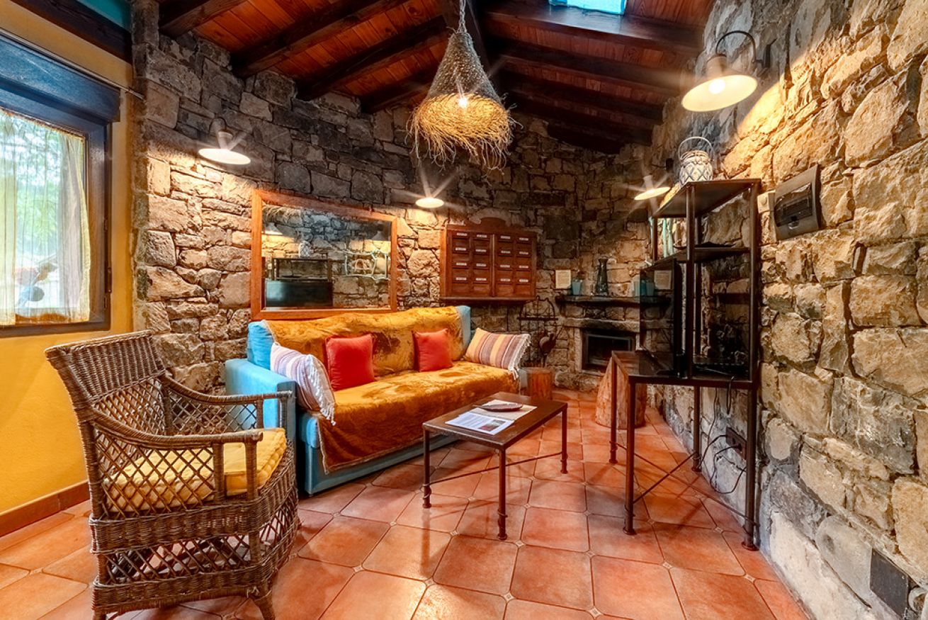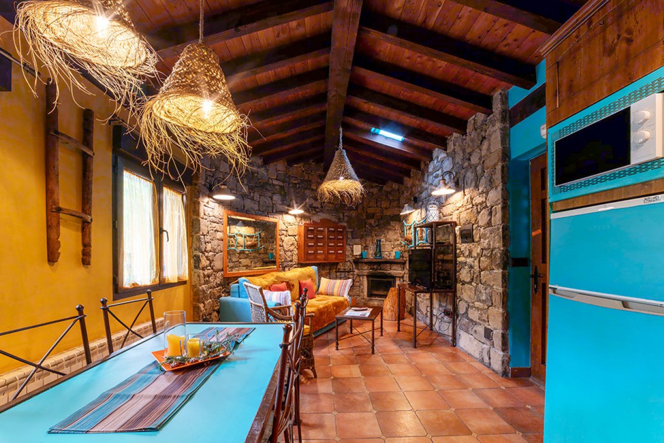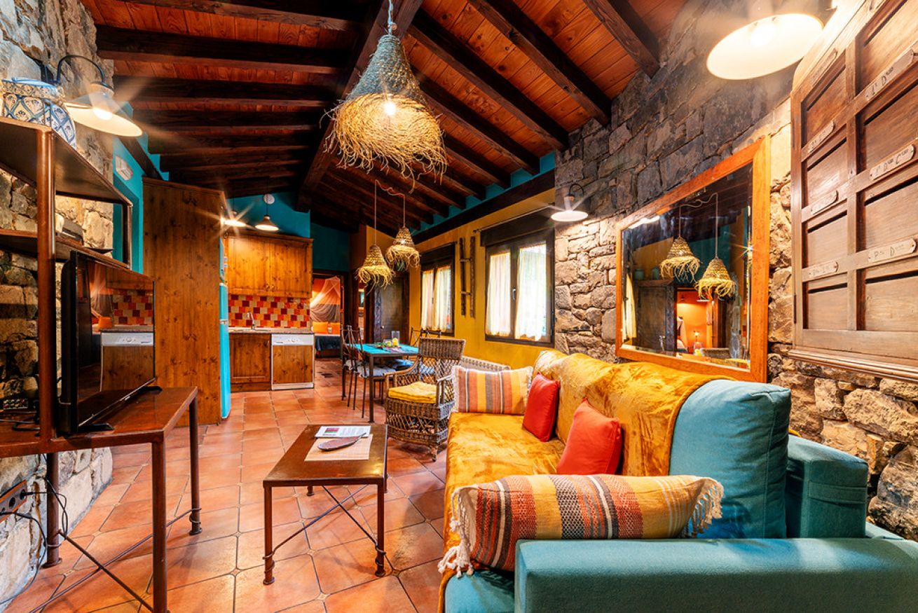 Consta de salón con paredes de piedra y chimenea. Cocina americana equipada con menaje y electrodomésticos. Dormitorio con cama de 150. Cuarto de baño con jacuzzi extra grande redondo. Jardín privado. Capacidad 2 personas y posibilidad de 2 personas mas en sofá cama.